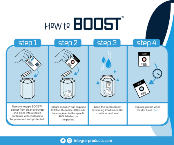 Integra boost es un producto único que controla la humedad relativa en 2 vías, aumentando o reduciéndola para mantener una constante del 62%. Los resultados de un curado con Integra boost maximizan eficacia, aroma, color y sabor a la vez que permiten una combustión más suave. Se ha convertido en un referente debido a que con este gel se puede almacenar indefinidamente mientras esté activo.Especificaciones: